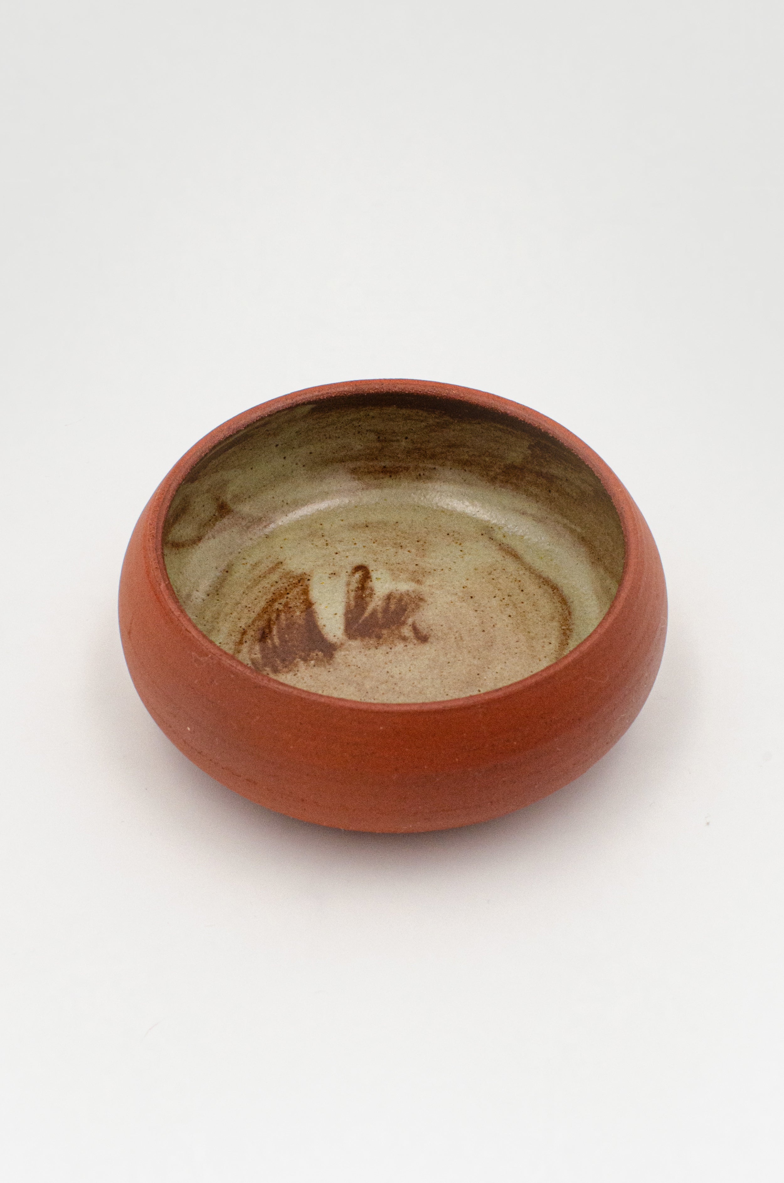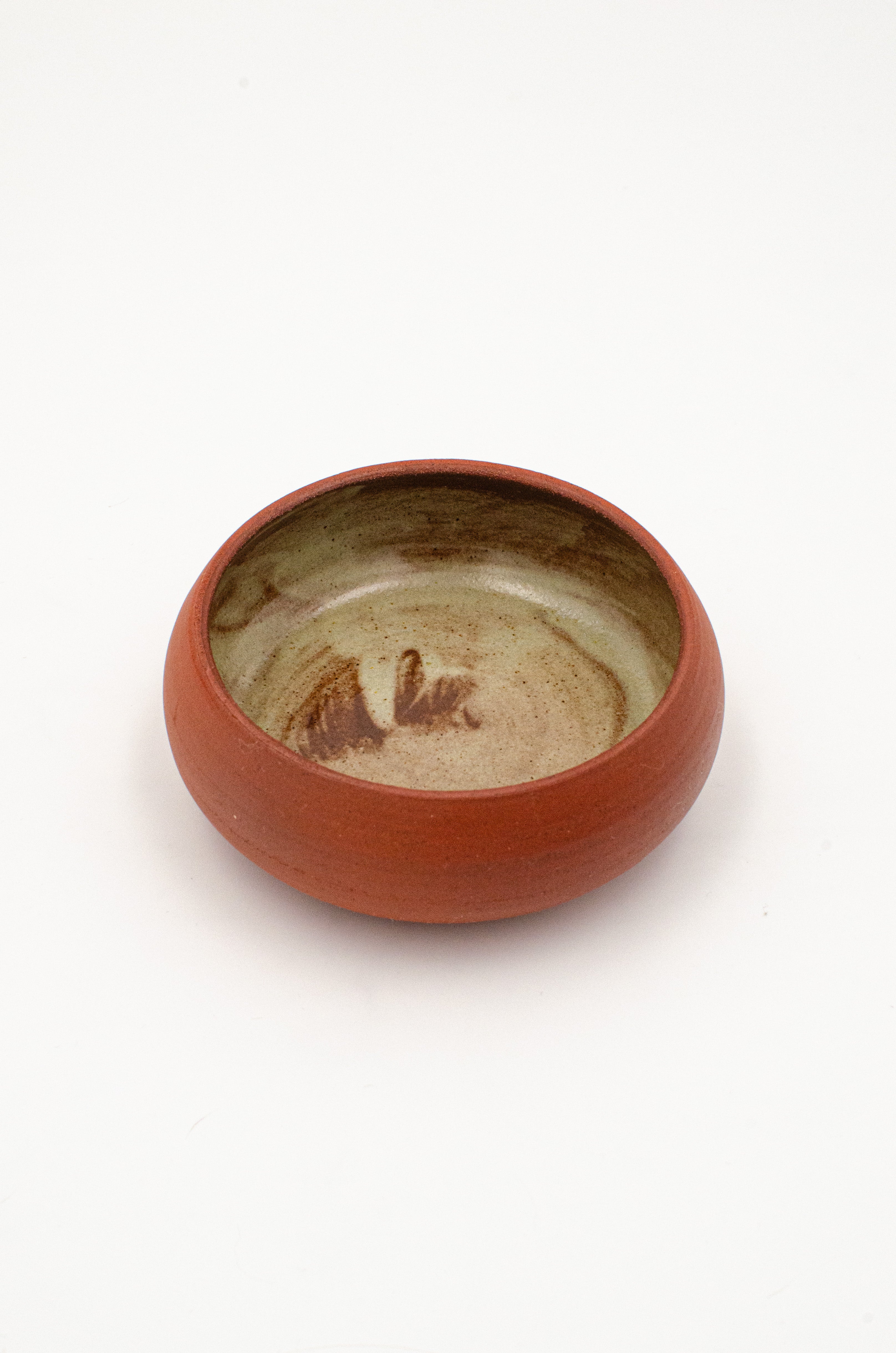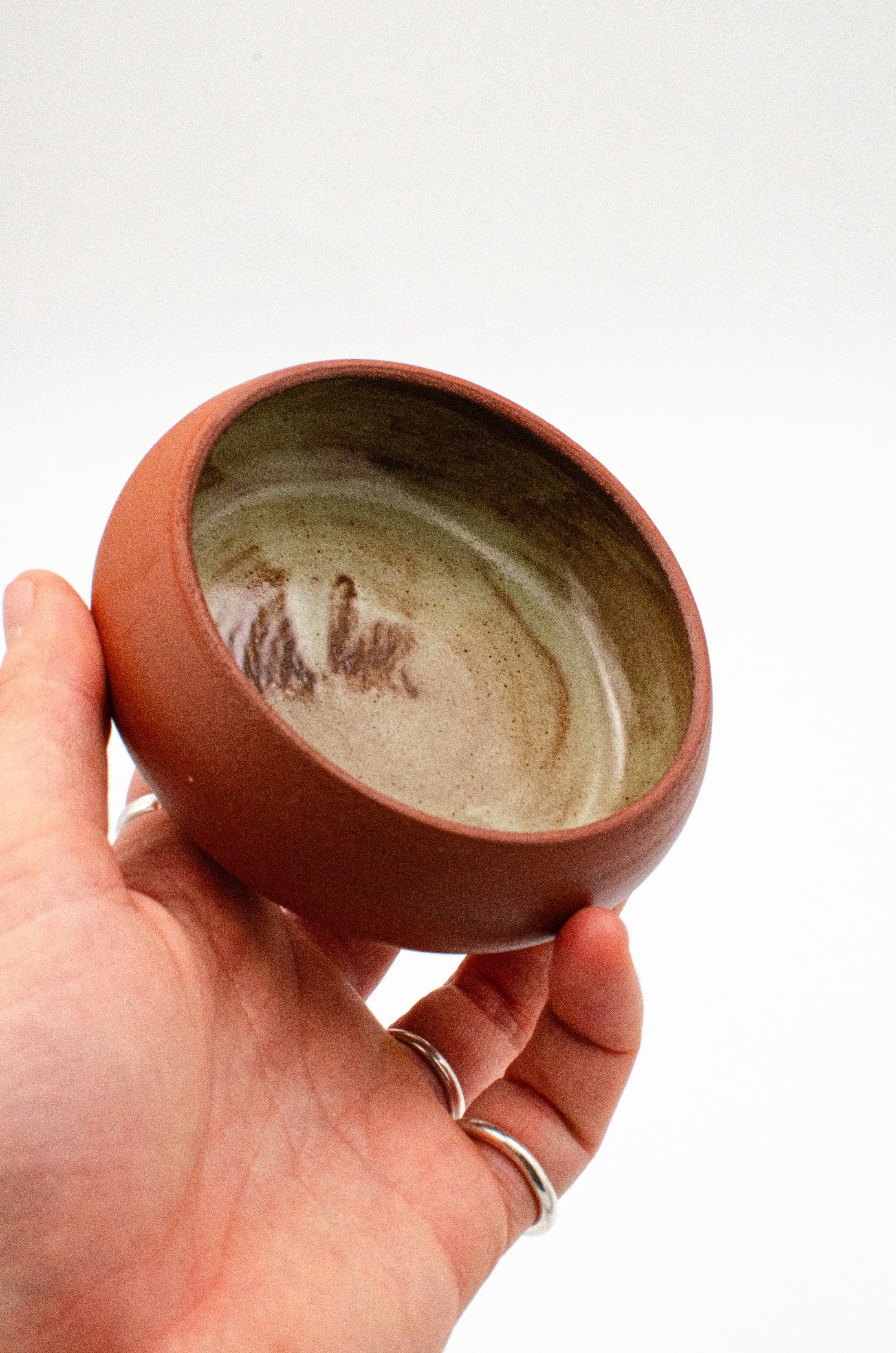 A small catch-all dish. Perfect for rings, jewelry, or keys. The inside is finished with a cream glaze with the red of the clay peeking from below while the outside is left raw with burnished dark red clay.
