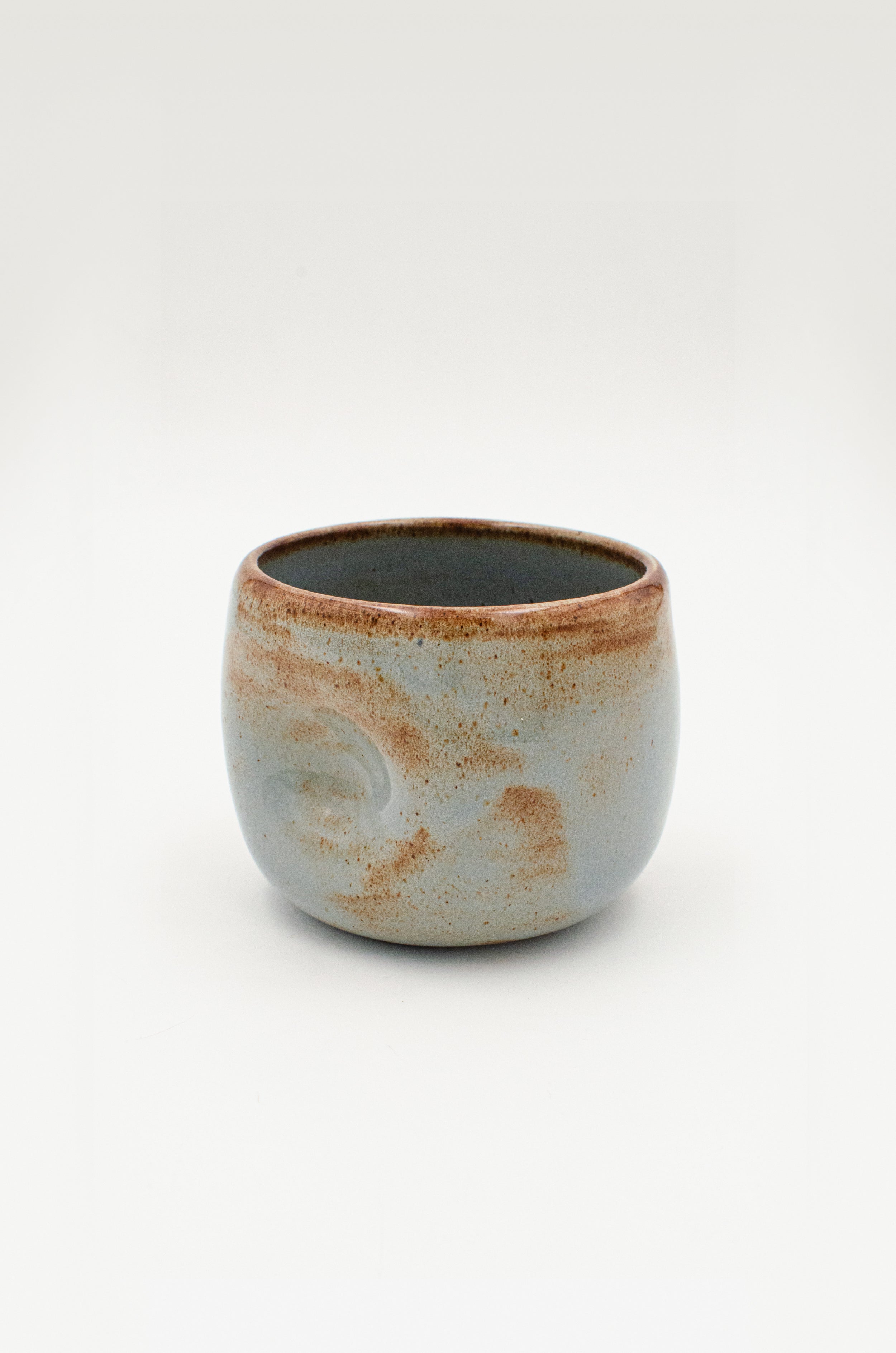 Pale stone blue glaze mottled with soft rust freckles from the dark red clay beneath showing natural variation.