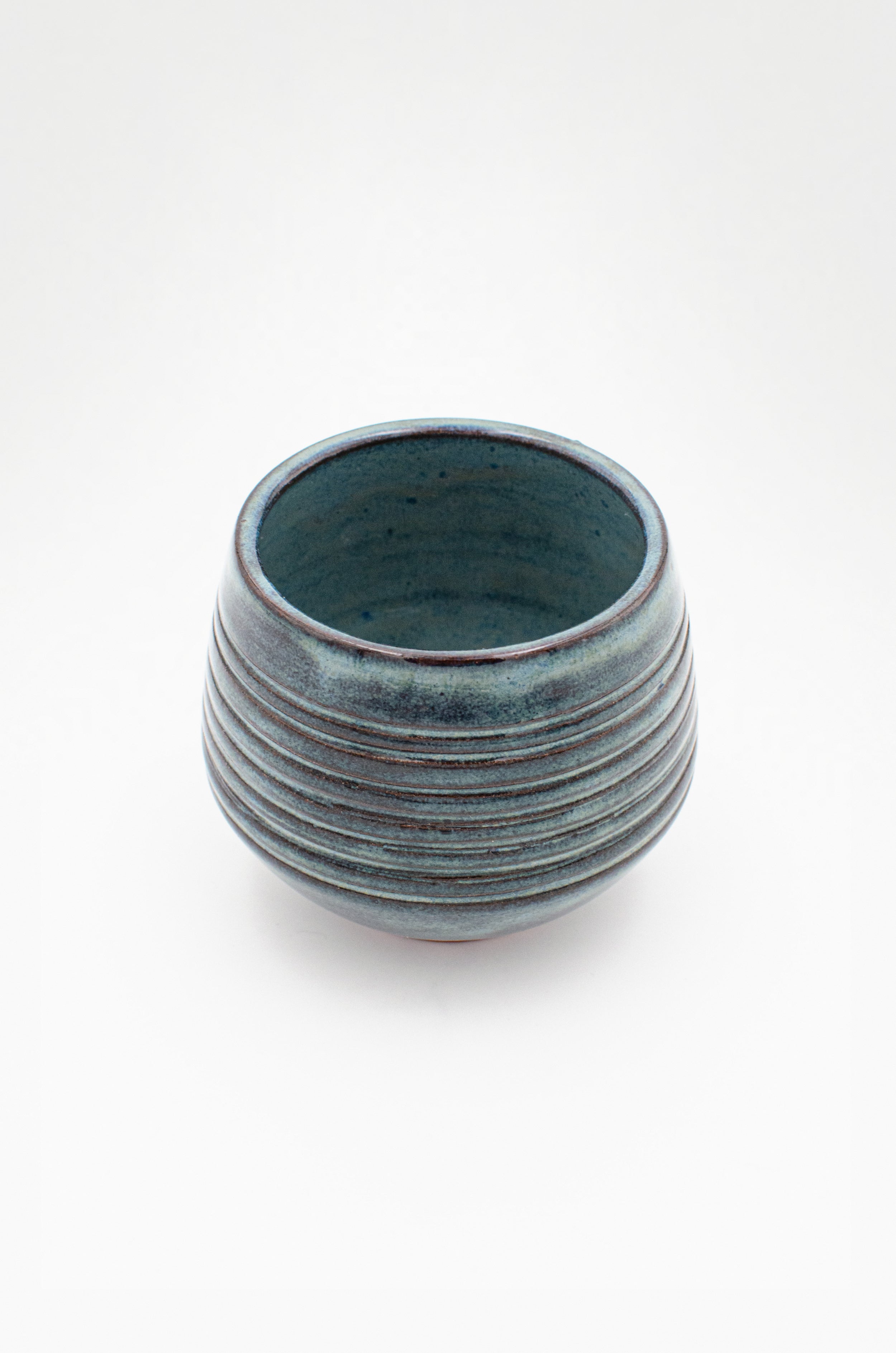 A low tapered cup with an angular bottom and pronounced foot. The ribbed texture highlights the variation of the dark blue glaze with peaks of the red clay breaking through from beneath.