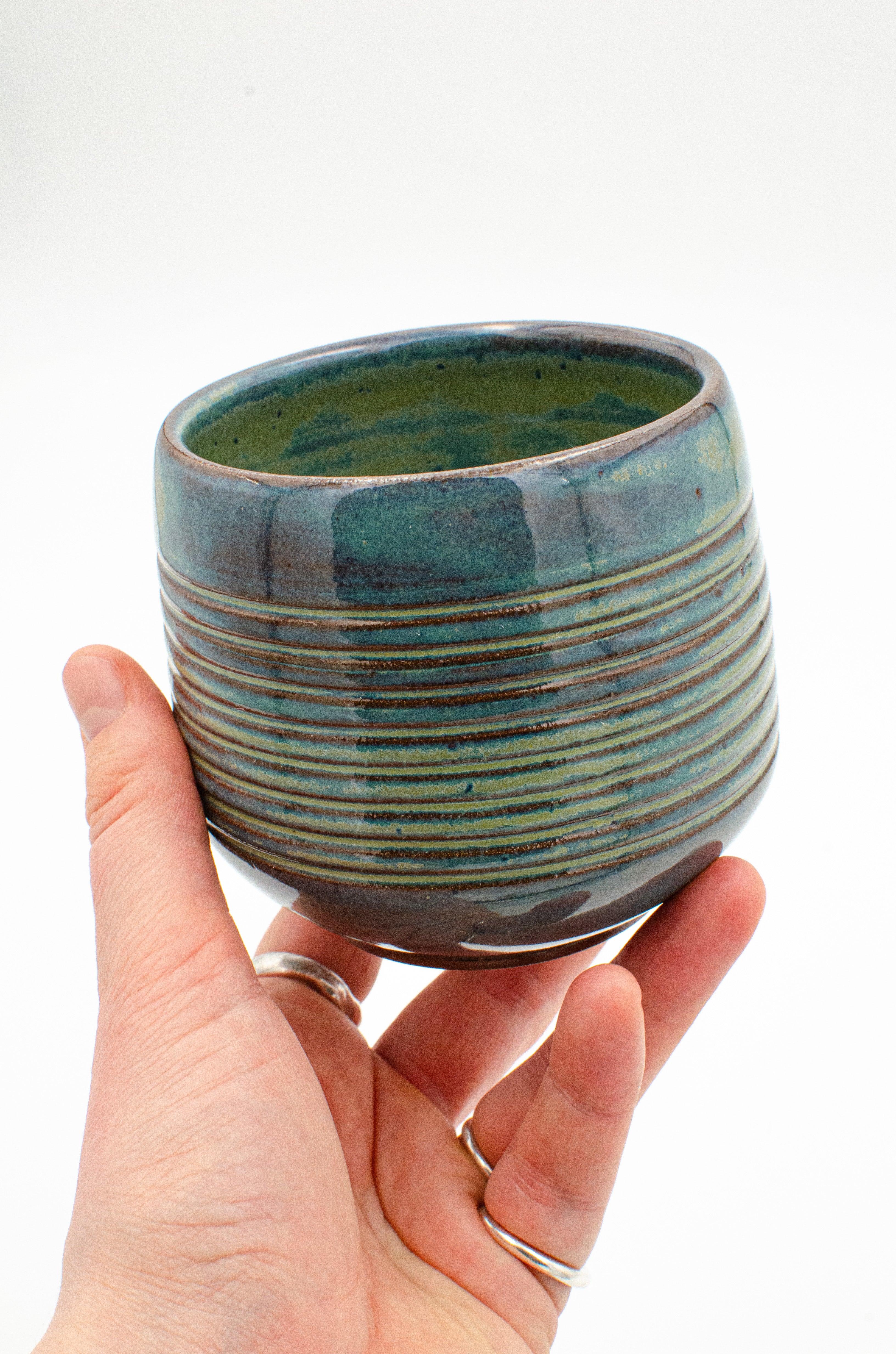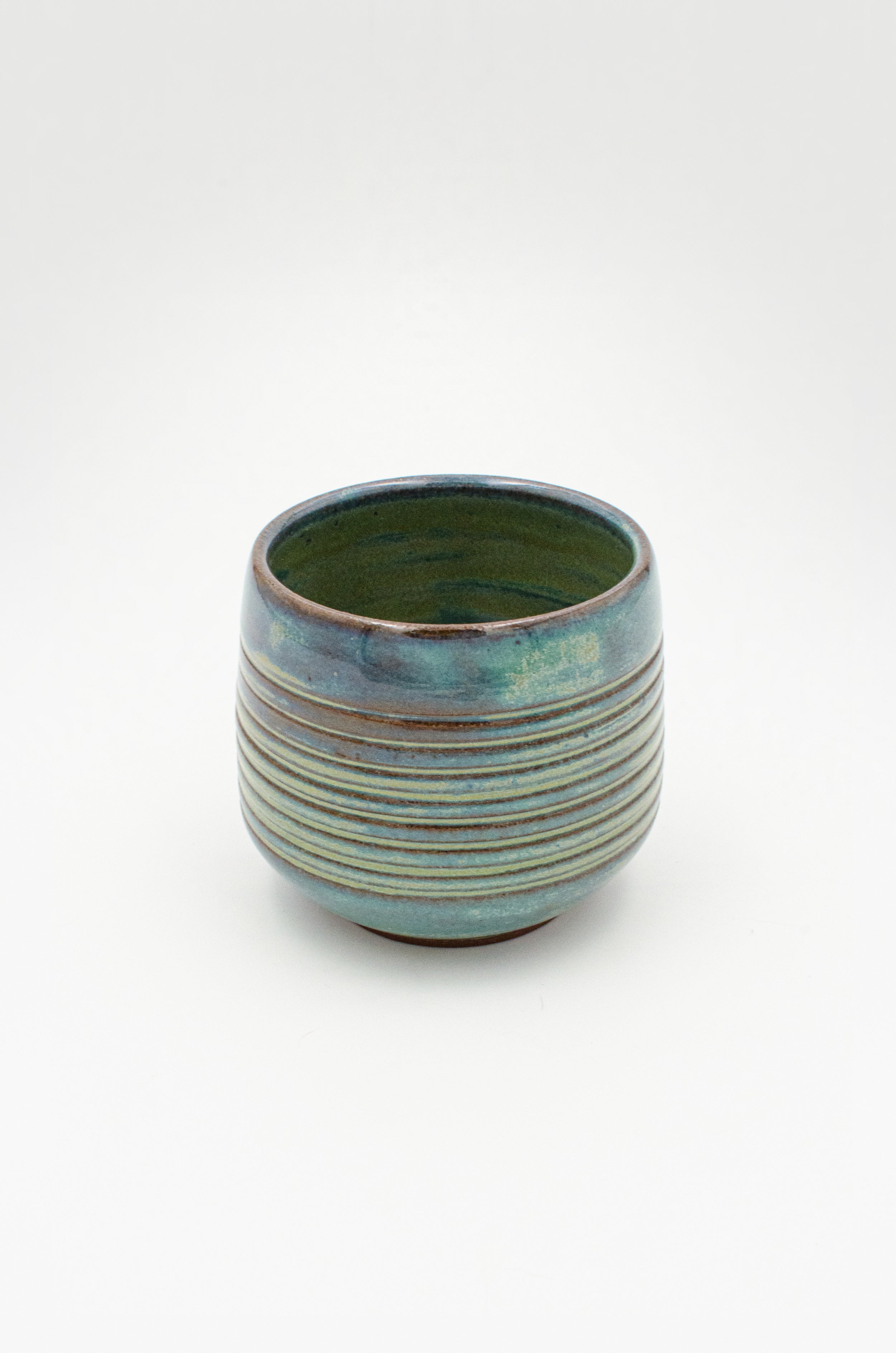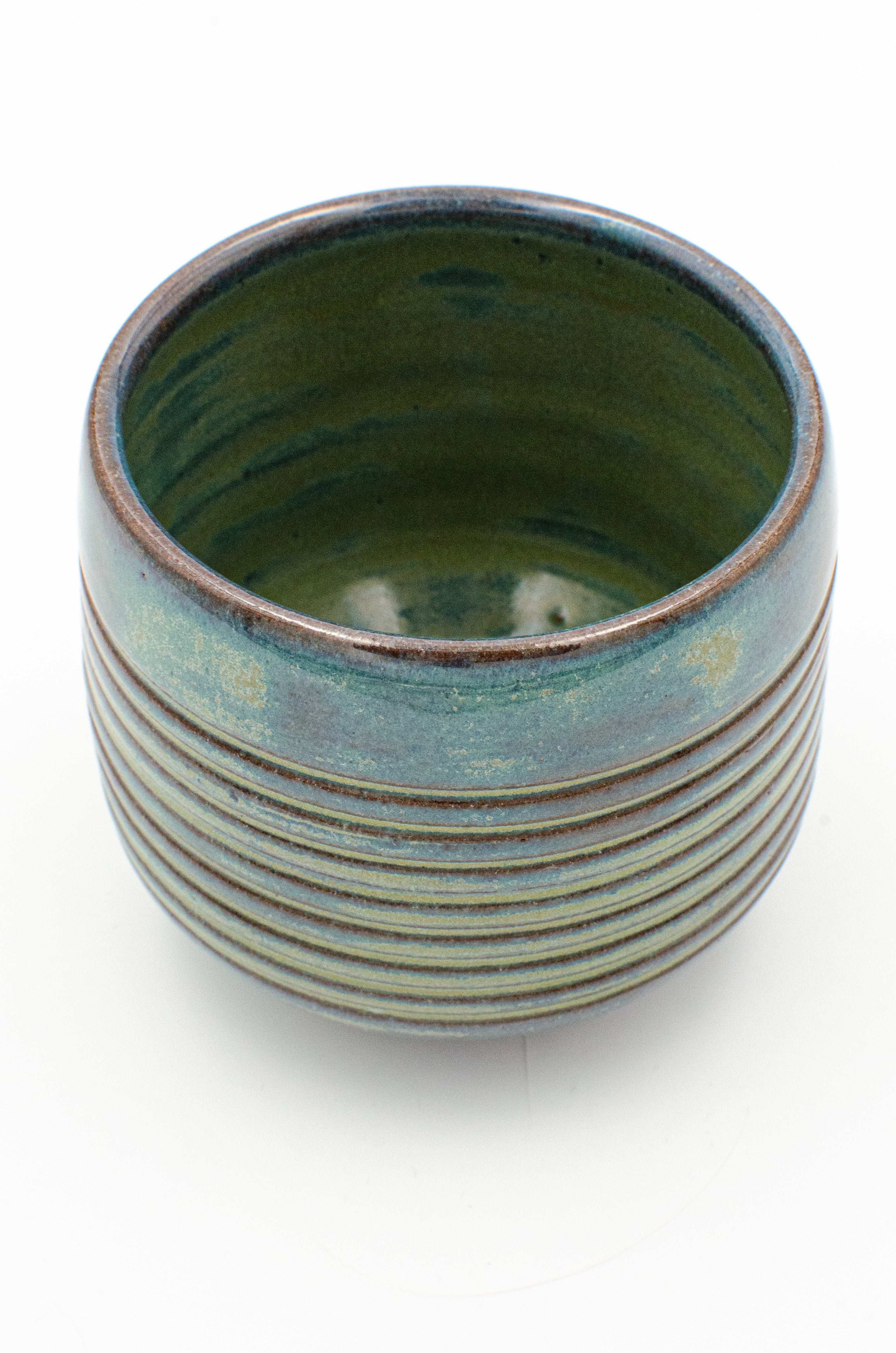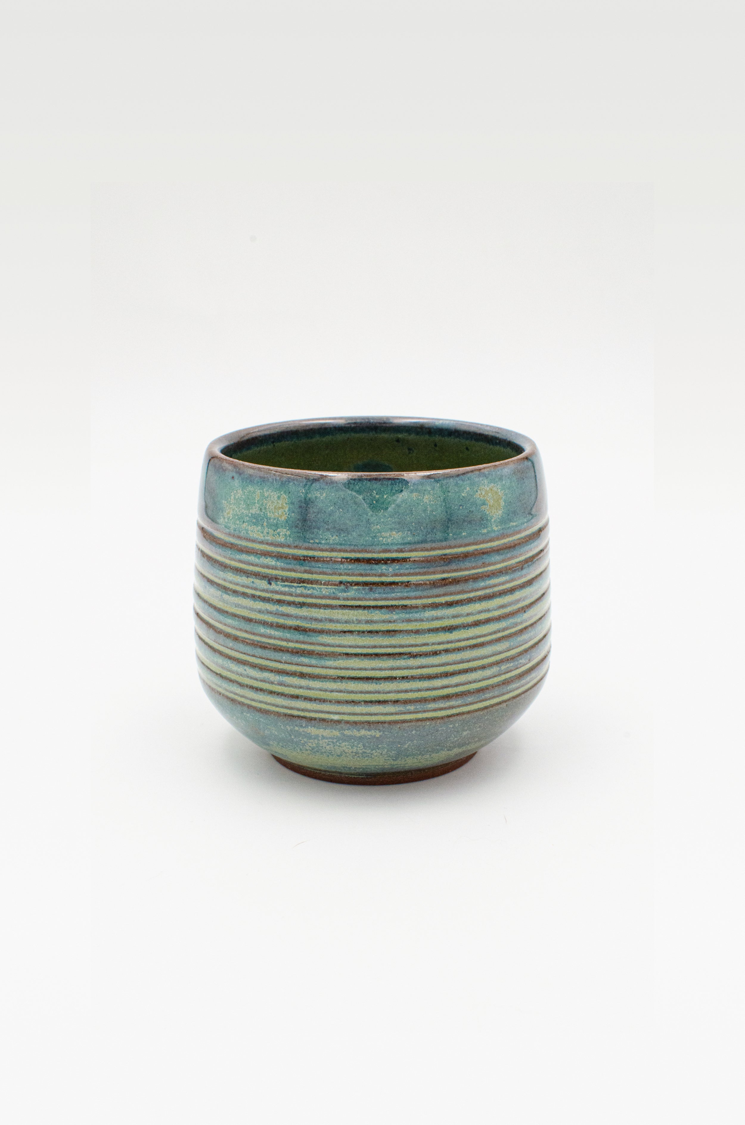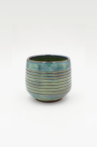 A low, tapered cup with an angular bottom and pronounced foot. Ribbed texture that highlights the verdigris glaze that blends from turquoise to blue with rusty red undertones, reminiscent of the blue-green patina of aged copper.